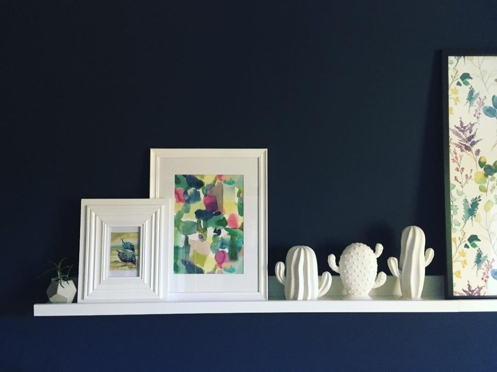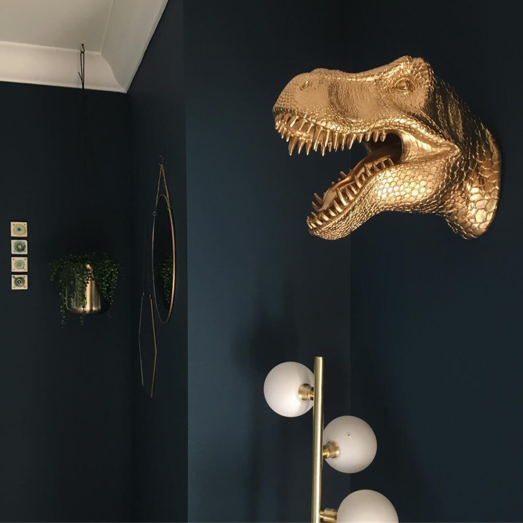 One of my favourite rooms is the spare bedroom which we had painted in Farrow & Ball “Hague Blue” which really makes the Sophie Abbott print pop and looks amazing with lots of Bluebellgray touches like the blind, bedding and wallpaper samples as art, plus my fun golden dino.
